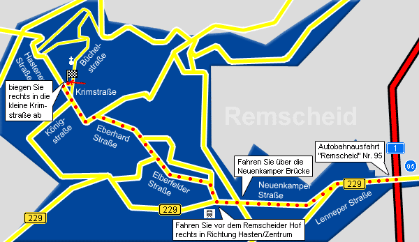 Verlassen Sie die Autobahn A1 an der Ausfahrt Remscheid (95) und biegen Sie rechts auf die B229 (Lenneper Straße) rechts in Richtung Remscheid/Solingen. Bleiben Sie die nächsten 3 Kilometer bis zur Neuenkamper Brücke auf dieser Straße. Am großen Kreisverkehr am Hotel-Restaurant "Remscheider Hof" halten Sie sich rechts in Richtung Remscheid Zentrum/Hasten (die erste Ausfahrt des Kreisverkehrs). Nun folgen Sie der Elberfelder Straße durch die Innenstadt (am Allee Center vorbei) bis Remscheid-Hasten (ca. 2,5 Kilometer). Die Straße heißt hier Eberhardstraße. Von der Hastener Straße biegen Sie nach rechts in die Krimstrasse ab. Sie finden uns nach 50 Metern auf der linken Seite.